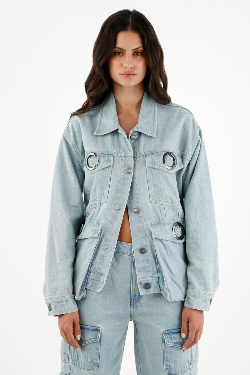 ¡Descubre la chaqueta oversize de tus sueños! Con esta prenda en tu clóset no sólo conseguirás un estilo audaz, sino también icónico de esta temporada. Características - Color: azul - En denim - Larga - Bolsillos cargo en frente sobredimensionados - Tapas con ojaletes grandes - Material: Algodón 100% Su estilo oversize te permitirá crear un look de capas, que es ideal para marcar tendencia y llevar en los días fríos.