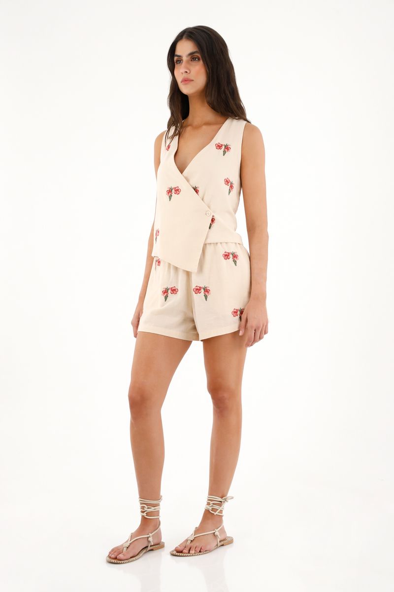 ¡Un esencial de estilo! Esta pieza de moda que se adapta a cualquier ocasión. Características - Color: crudo - Chaleco - Escote en V - Manga sisa - Forro delantero - Bordado de flores en delantero - Diseño cruzado en frente - Ajuste con botón en costado - Material: Algodón 100% Sobre el fit El diseño perfecto para darle a cada ocasión un toque moderno.