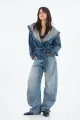 La chaqueta TNS reinterpreta el denim en 100% algodón con un cuello envolvente extra grande que muestra el revés más claro: un marco poderoso para el rostro y un guiño arty que cambia el equilibrio de cualquier look. El cinturón del mismo tejido te permite modular la silueta: ajústalo para una cintura definida o suéltalo para una caída relajada. Los hombros caídos y las mangas amplias suman volumen cool y movimiento, mientras el azul medio mantiene ese vibe limpio y combinable que vive en la ciudad.