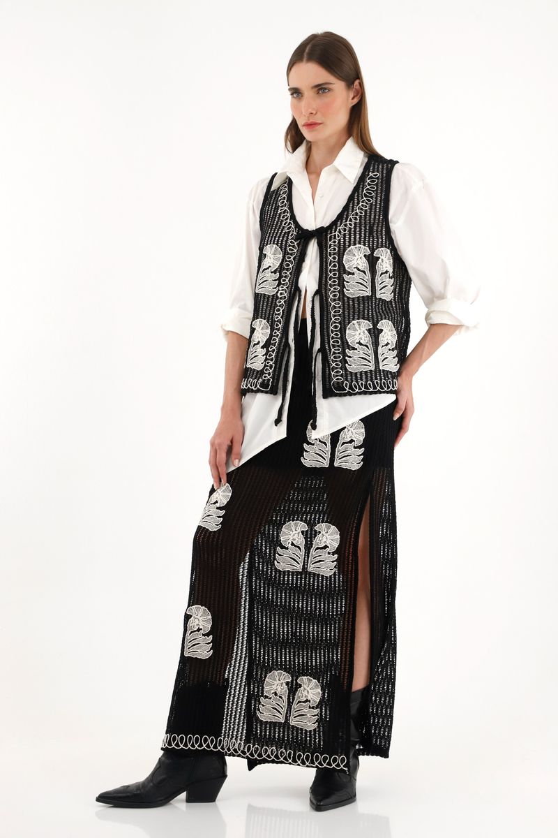 ¡El boho es la tendencia favorita! Este diseño tejido creará looks boho chic para transformar la cotidianidad. Características - Color: negro - Larga - Tipo tejida - Detalles desagujados - Pretina elástica - Aberturas en costados - Bordados en frente - Material: Forro Viscosa 95% Elastano 5% Exterior Poliéster 65% Algodón 35% Sobre el fit Un diseño que abraza las tendencias, combínalo con su prenda a juego para crear un estilo libre y llamativo.