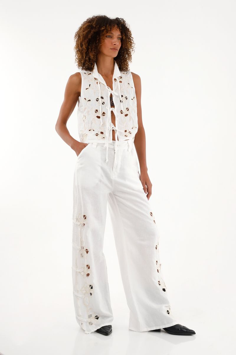 ¡Bordados que son tendencia! Este diseño te ayudará a crear looks clásicos con el toque juvenil y original que no te puede faltar. Características - Color: crudo - Tiro alto - Ajuste con botón y cierre ocultos - Aberturas en costados con sesgos y botón - Bordados a tono decorativos - Bolsillos diagonales - Bolsillos de parche en posterior - Material: Algodón 55% Lino 45% Sobre el fit Su corte Recto estiliza tu figura y lo hace versátil para cualquier ocasión en la que desees destacar.