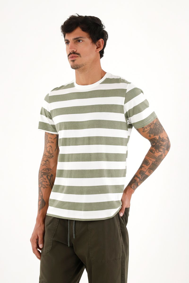 ¡Toda la practicidad que buscas está en esta camiseta! Úsala en tus días de relax y siéntete tan cómodo como moderno. Características - Color: multicolor - Manga corta - Cuello redondo en rib - Estampado de rayas verdes - Material: Algodón 100% Sobre el fit Con una silueta básica y que nunca falla, esta camiseta es el must have perfecto para cualquier plan casual.